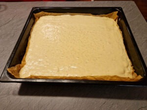 - Maso vlijemo v pekač, poravnamo in pečemo 35–45 minut, da lepo zlato porjavi.